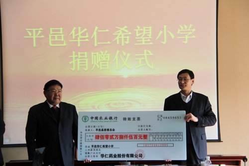 2015年12月4日,平邑華仁希望小學(xué)捐贈(zèng)儀式在華仁藥業(yè)舉行。出席捐贈(zèng)儀式的有平邑縣副縣長(zhǎng)王琨、民政局局長(zhǎng)劉濤、街道黨工委書記孟凡民、統(tǒng)戰(zhàn)委員邱繼霞、街道長(zhǎng)山保護(hù)區(qū)西張三支部書記邵小平、華仁藥業(yè)董事長(zhǎng)梁富友及高管團(tuán)隊(duì)。