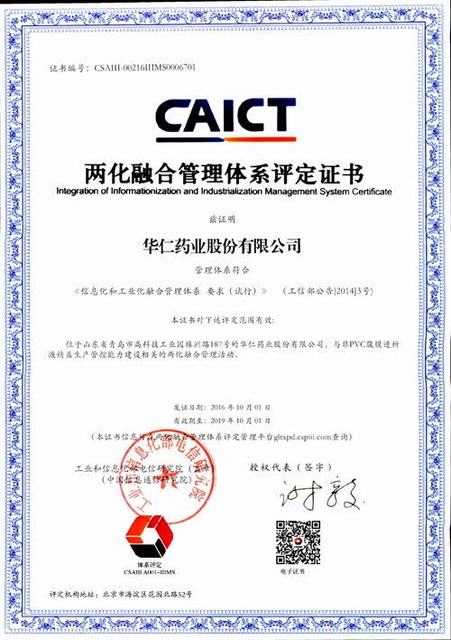 10月10日,公司以“非PVC腹膜透析液精益生產(chǎn)管控能力”通過國家兩化融合管理體系評定,獲得由國家工業(yè)和信息化部通信研究院頒發(fā)的《兩化融合管理體系評定》證書,這是公司智能制造綜合實力進一步提升的象征。