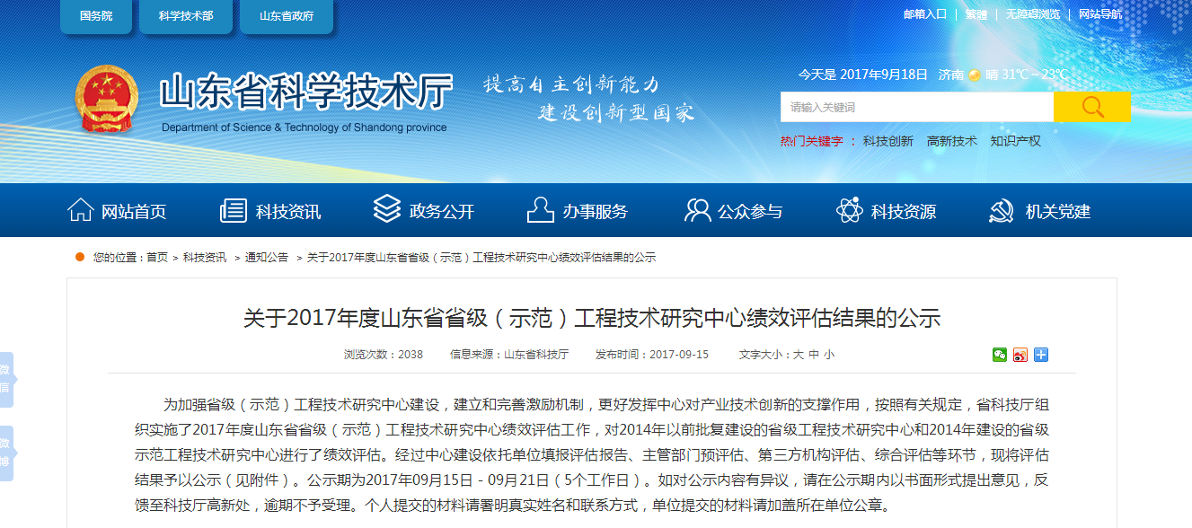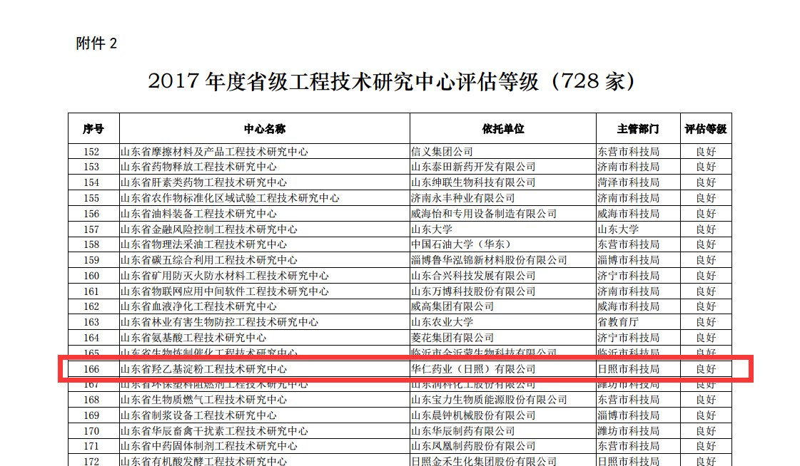 9月15日,山東省科學(xué)技術(shù)廳對2017年度山東省省級(示范)工程技術(shù)研究中心績效評估結(jié)果進行了公示,由華仁藥業(yè)(日照)有限公司籌建的山東省羥乙基淀粉工程技術(shù)研究中心績效評估等級結(jié)果良好,順利通過評估進入公示,本次公示期為2017年9月15日-9月21日(5個工作日)。