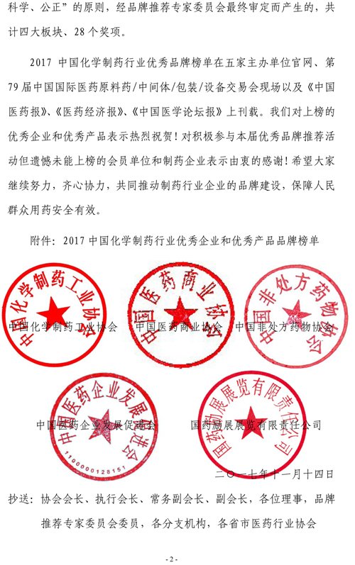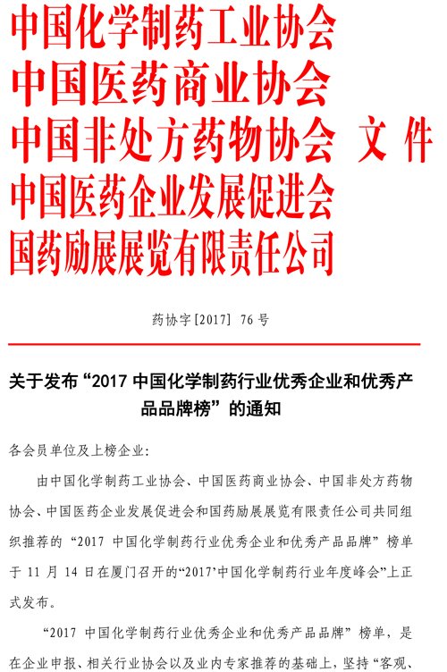 “2017 中國化學(xué)制藥行業(yè)優(yōu)秀企業(yè)和優(yōu)秀產(chǎn)品品牌”榜單,是在企業(yè)申報、相關(guān)行業(yè)協(xié)會以及業(yè)內(nèi)專家推薦的基礎(chǔ)上,堅持“客觀、科學(xué)、公正”的原則,經(jīng)品牌推薦專家委員會最終審定而產(chǎn)生的,共計四大板塊、28 個獎項。2017 中國化學(xué)制藥行業(yè)優(yōu)秀品牌榜單在五家主辦單位官網(wǎng)、第79 屆中國國際醫(yī)藥原料藥/中間體/包裝/設(shè)備交易會現(xiàn)場以及《中國醫(yī)藥報》、《醫(yī)藥經(jīng)濟報》、《中國醫(yī)學(xué)論壇報》上刊載。