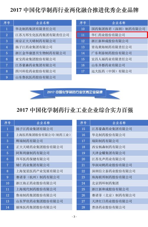 由中國化學(xué)制藥工業(yè)協(xié)會、中國醫(yī)藥商業(yè)協(xié)會、中國非處方藥物協(xié)會、中國醫(yī)藥企業(yè)發(fā)展促進(jìn)會和國藥勵展展覽有限責(zé)任公司共同組織推薦的“2017 中國化學(xué)制藥行業(yè)優(yōu)秀企業(yè)和優(yōu)秀產(chǎn)品品牌”榜單于 11 月 14 日在廈門召開的“2017’中國化學(xué)制藥行業(yè)年度峰會”上正式發(fā)布。華仁藥業(yè)榮獲“2017中國化學(xué)制藥行業(yè)工業(yè)企業(yè)綜合實力百強”、“2017中國化學(xué)制藥行業(yè)兩化融合推進(jìn)優(yōu)秀企業(yè)品牌”榮譽稱號。