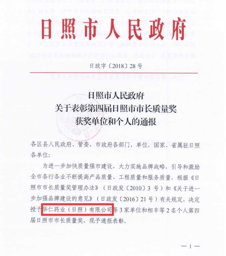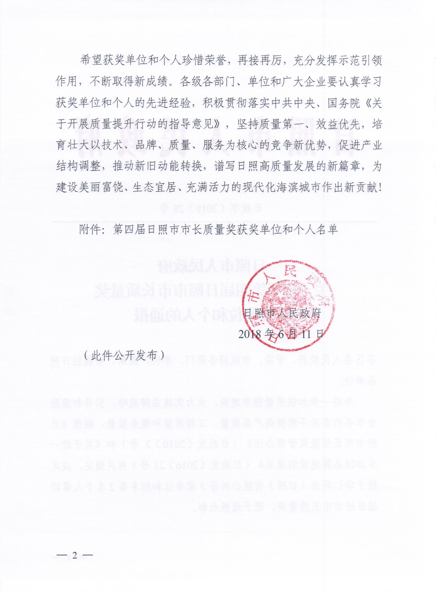 日照市市長(zhǎng)質(zhì)量獎(jiǎng)是日照市人民政府設(shè)立的最高質(zhì)量獎(jiǎng)項(xiàng),由日照市質(zhì)量興市工作領(lǐng)導(dǎo)小組組織評(píng)審,由日照市人民政府和市長(zhǎng)審定批準(zhǔn)、表彰和獎(jiǎng)勵(lì)。近年來,公司通過推進(jìn)實(shí)施卓越績(jī)效管理,樹立質(zhì)量標(biāo)桿,經(jīng)濟(jì)效益和社會(huì)效益增長(zhǎng)顯著,在日照市加快質(zhì)量強(qiáng)市建設(shè)和實(shí)施品牌戰(zhàn)略中起到了積極的引領(lǐng)和示范作用。
