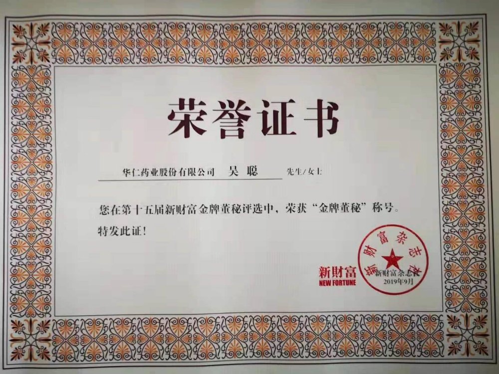 該榮譽(yù)的取得不僅是對吳聰總個(gè)人專業(yè)的嘉獎,更是體現(xiàn)了資本市場對華仁藥業(yè)董事會工作的認(rèn)可。在接下來的工作中,華仁藥業(yè)董事會將以“金牌董秘”為標(biāo)桿積極開展工作,通過資本運(yùn)作、對外投資引進(jìn)優(yōu)質(zhì)合作標(biāo)的,為股東持續(xù)創(chuàng)造價(jià)值。