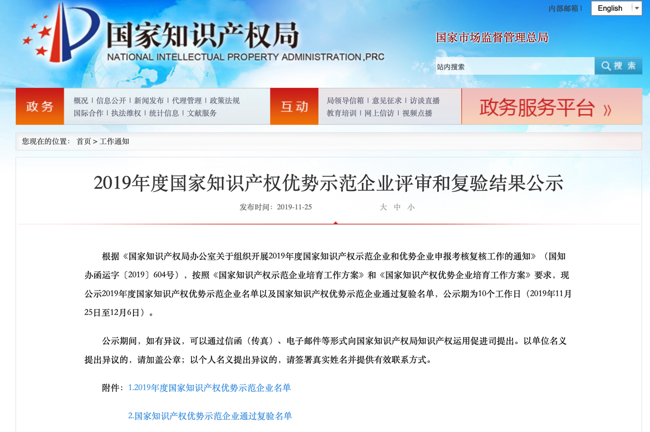 國(guó)家知識(shí)產(chǎn)權(quán)局2019年度國(guó)家知識(shí)產(chǎn)權(quán)優(yōu)勢(shì)示范企業(yè)評(píng)審和復(fù)驗(yàn)結(jié)果公示鏈接:http://www.cnipa.gov.cn/gztz/1144067.htm