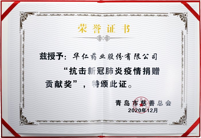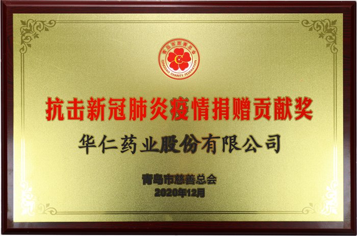 面對(duì)突如其來的新冠肺炎疫情,華仁藥業(yè)作為國(guó)有控股醫(yī)藥上市企業(yè),牢記為人類健康服務(wù)的使命初心,積極踐行社會(huì)責(zé)任與擔(dān)當(dāng),勇敢逆行,堅(jiān)守崗位,以實(shí)際行動(dòng)為抗擊疫情貢獻(xiàn)綿薄之力。經(jīng)過組織評(píng)選,青島市慈善總會(huì)授予華仁藥業(yè)股份有限公司“抗擊新冠肺炎疫情捐贈(zèng)貢獻(xiàn)獎(jiǎng)”榮譽(yù)稱號(hào)。