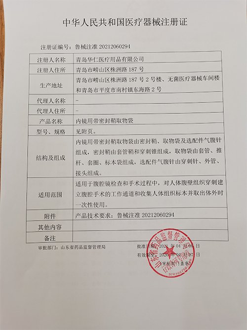近日,華仁藥業(yè)股份有限公司(300110)全資子公司青島華仁醫(yī)療用品有限公司收到山東省藥品監(jiān)督管理局核準(zhǔn)簽發(fā)的內(nèi)鏡用帶密封鞘取物袋《醫(yī)療器械注冊(cè)證》,注冊(cè)證號(hào):魯械注準(zhǔn)20212060294。